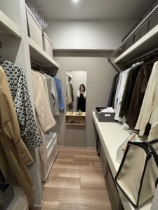 ウォークスルーのクローゼットは、奥行きの深さ、ハンガーパイプの位置までこだわりが詰まっています。